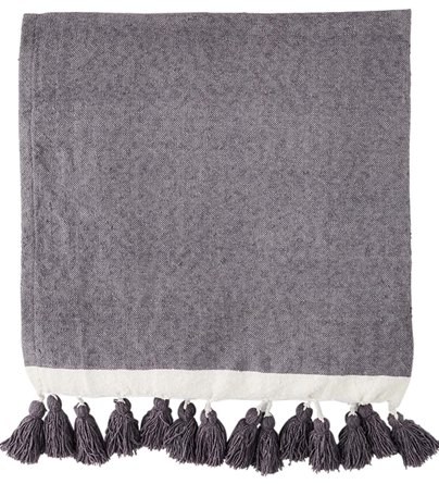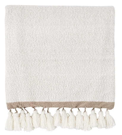 Lightweight cotton blanket features woven border stripe and tassel trim.