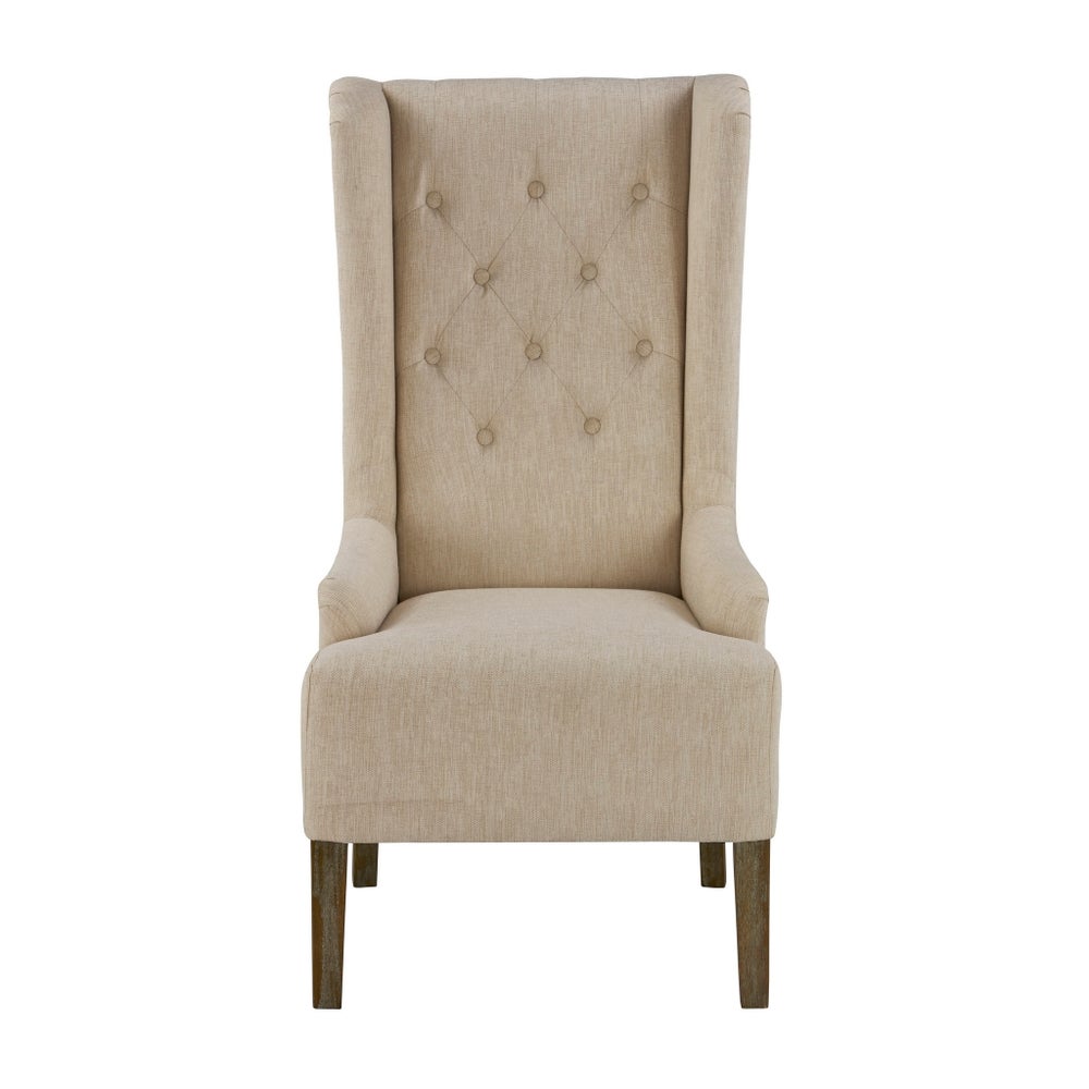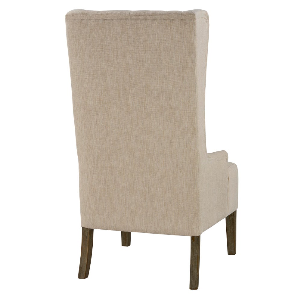 Update your home décor with the Riley Wing Chair. The luxurious linen texture will add a touch of elegance to any room, and the warm grey and cream tones will easily match with existing furniture. This sturdy chair includes nailhead detail on the arms and a thick foam cushion for superior comfort and support.