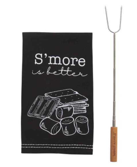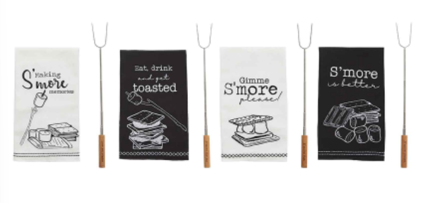 Embroidered cotton hand towel. Comes with expandable wood and metal roasting stick.