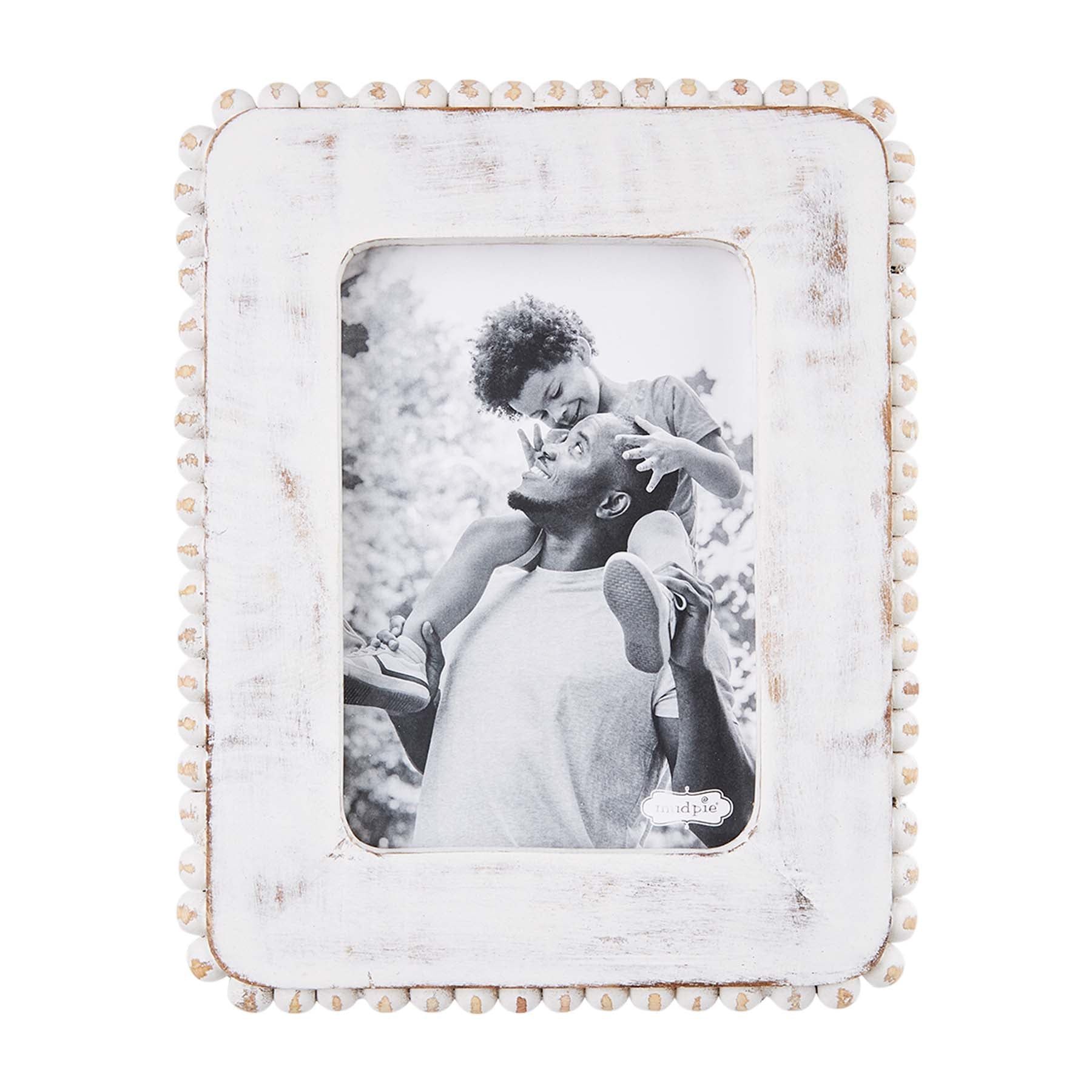 White-washed mango wood frame features beaded edge and holds 5" x 7" photo. Stands with back easel.