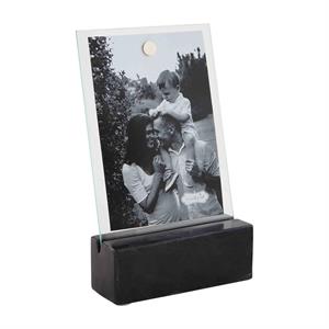 Glass pane holds 4" x 6" photo with gold rivet magnet. Glass stands upright in marble base.