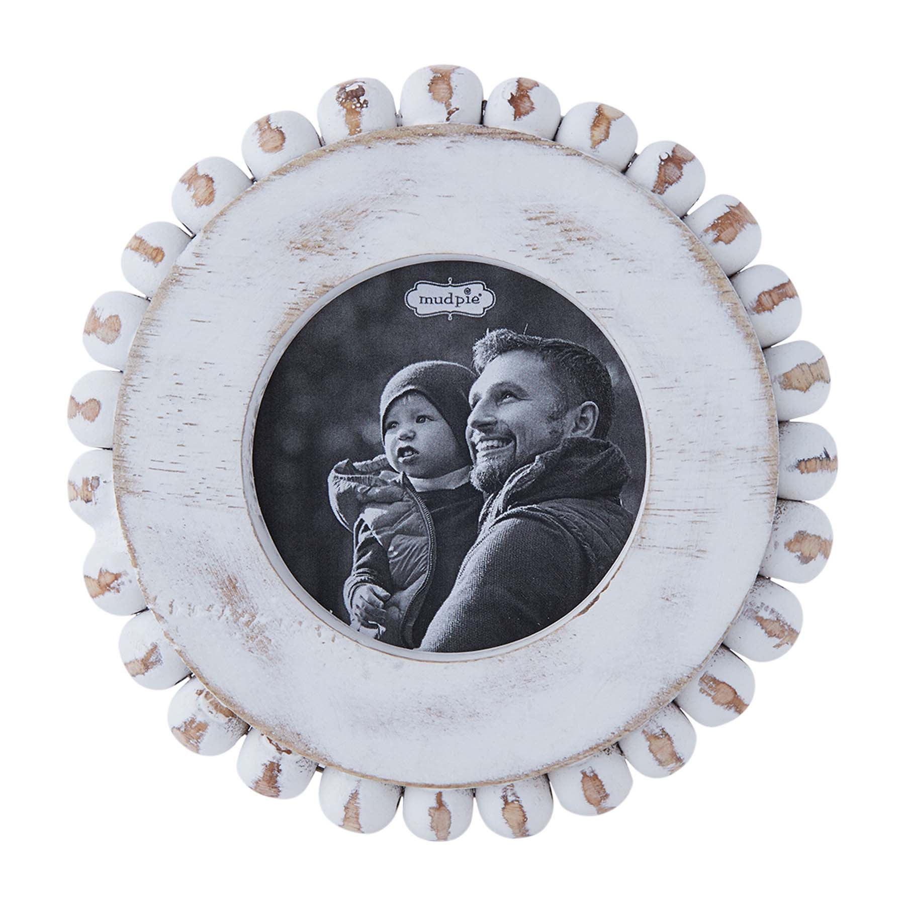 White-washed mango wood frame features beaded edge and holds 3" diameter. Stands with back easel.