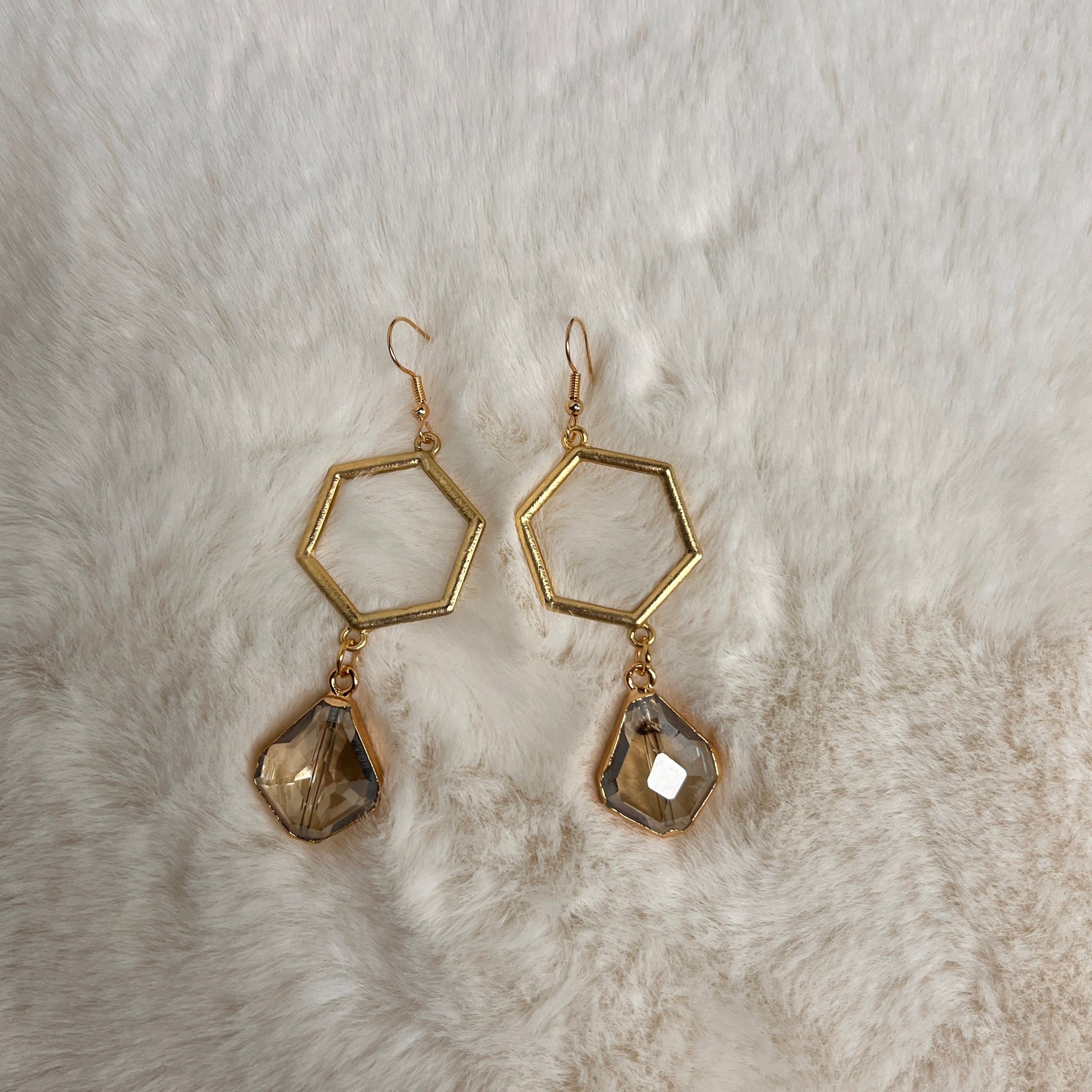 The Emma earrings feature fog colored stone beneath a gold hexagon. They are the perfect complement to any outfit.