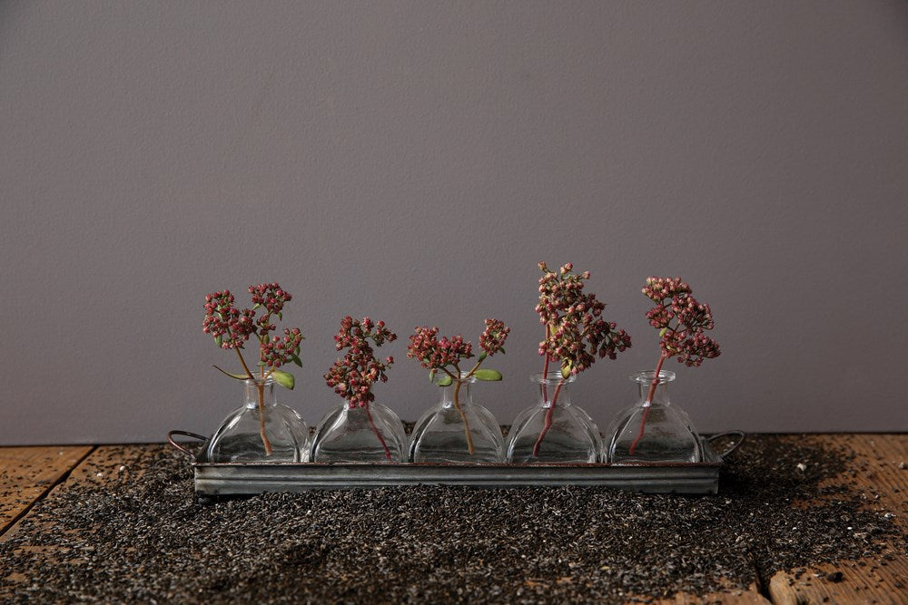 16"L x 3 1/2"H decorative metal tray with 5 glass vases