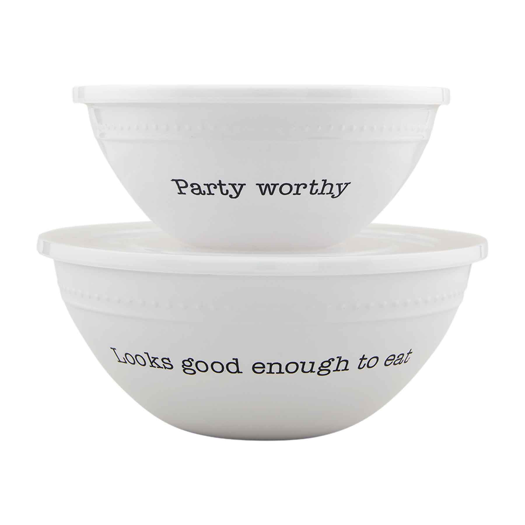 4-piece set. Nested set of two beaded melamine serving bowls with plastic air-tight lids.