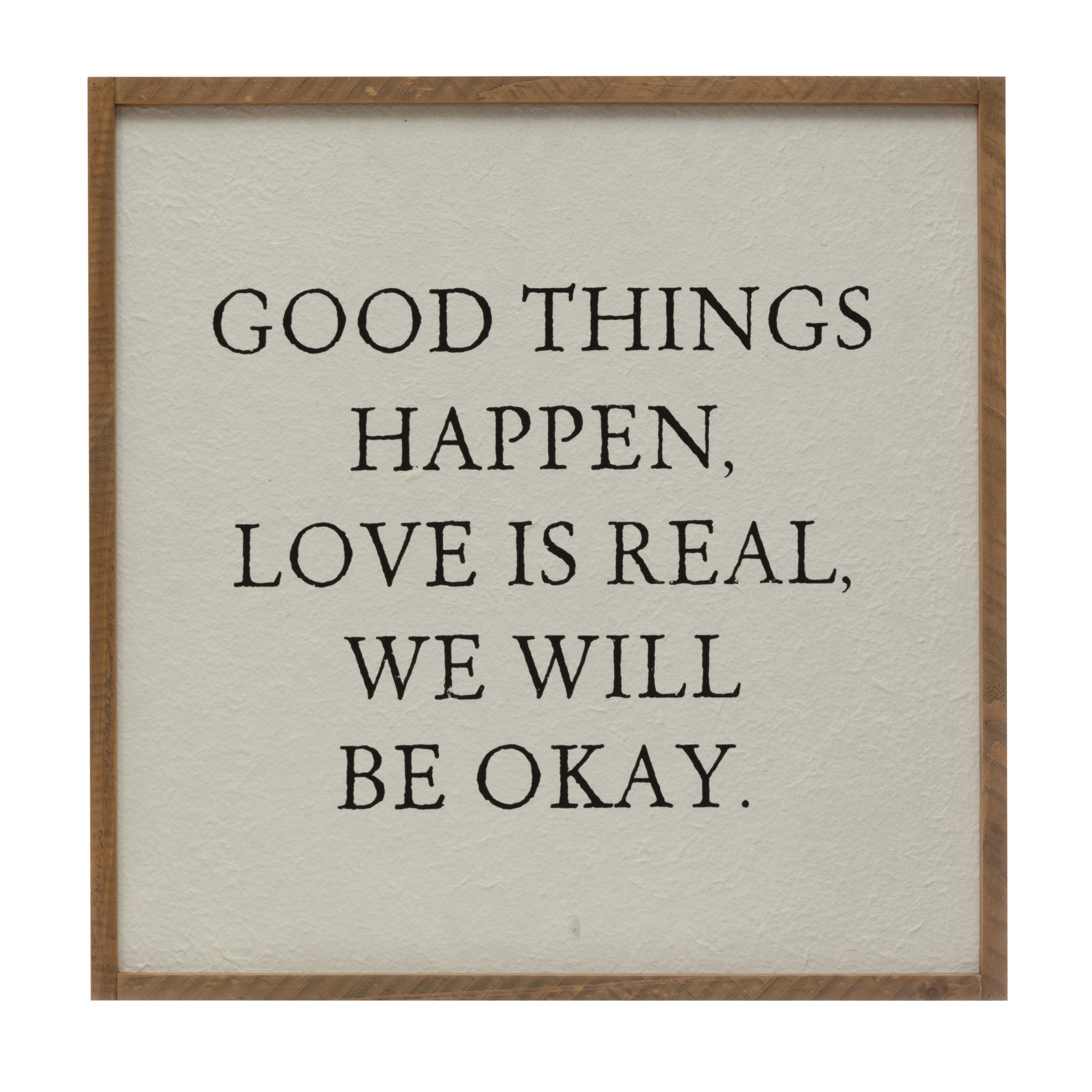 This engaging and uplifting framed wall decor reads, "Good Things Happen, Love is Real, We Will be Ok." A thought-provoking and simple accent piece that will look great in any room in your home or office.