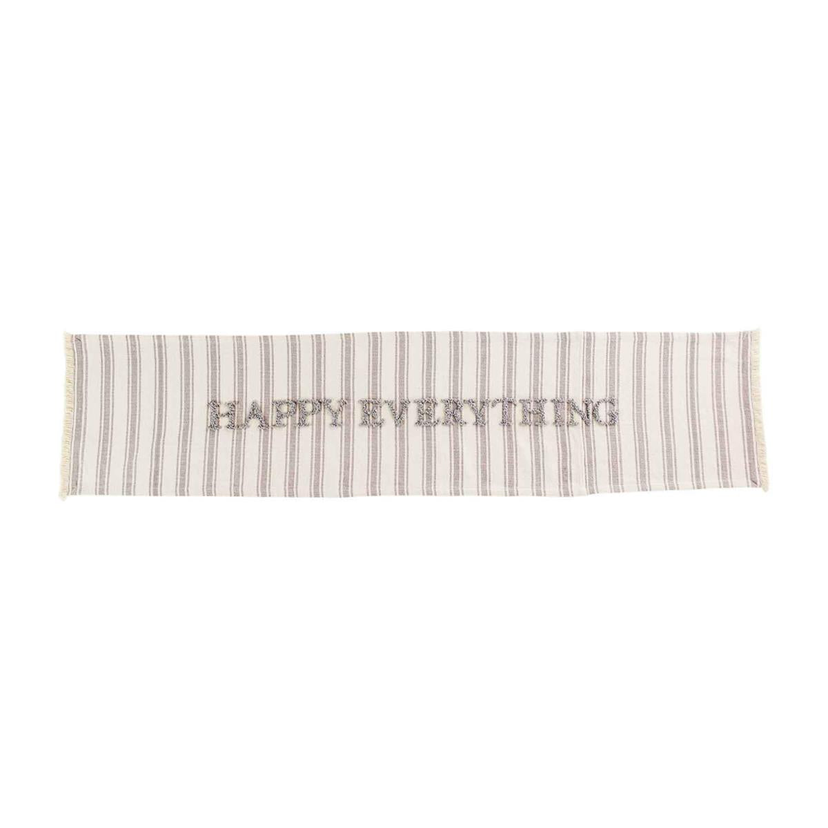 Cotton table runner features tufted sentiment appliqué and fringe trim.