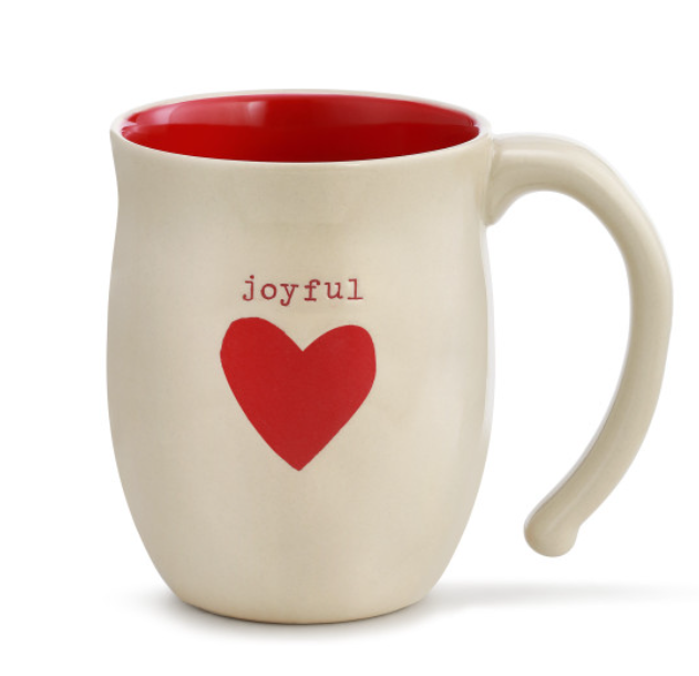 This hand-thrown stoneware mug features a cozy and unique message that reads, "Joyful," and a red heart at the outside with a red inside. The homemade feel of this mug and handle makes it easy to wrap your hands around and enjoy your favorite toasty warm beverage, from coffee to tea to hot chocolate and everything in between. Each piece from this collection is great for wrapping oneself in the love and warmth felt throughout the holiday season when spending time with friends, family and other loved ones. With a special gift bag included, this item comes ready to gift to anyone on your list to let them know that you are thinking of them, warming their hands and their heart.