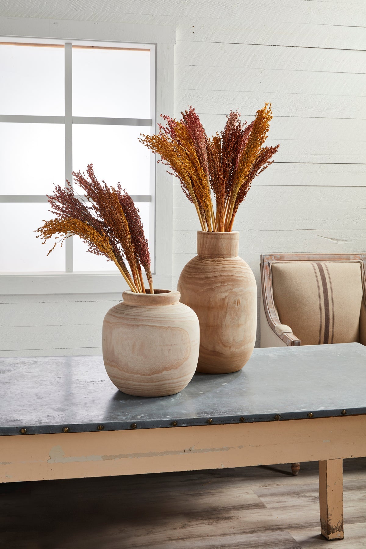 This large paulownia wood pot is a simple décor piece that can transform your space. The generous sized paulownia wood decorative pot measures 18 1/2" x 10" dia. This pot is intended to be filled with dried florals or plants only. We recommend our Pampas Grass or Lagrus grass.