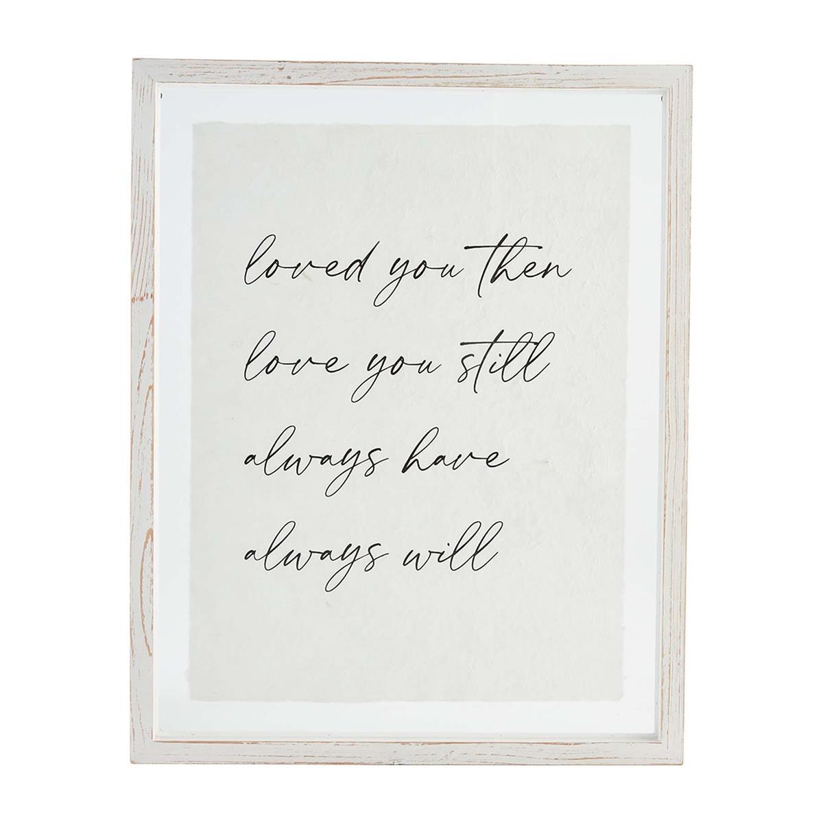 Printed handmade parchment paper floats between pressed glass panes and distressed wood frame.