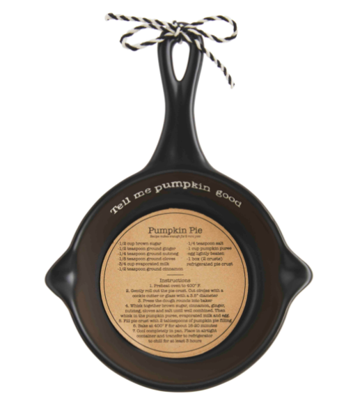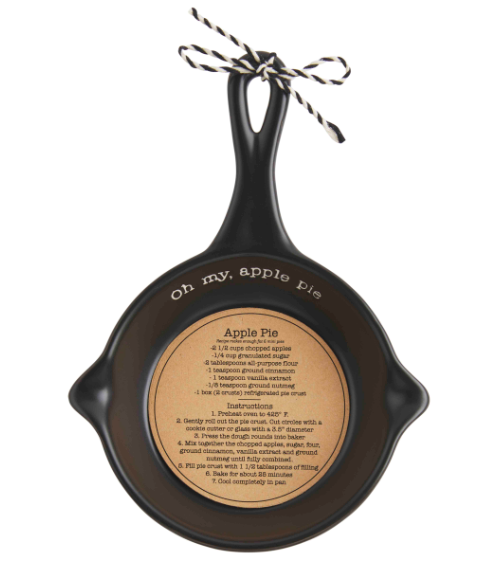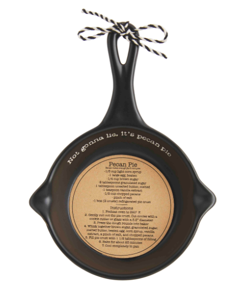 Stoneware mini skillet comes with kraft recipe insert.