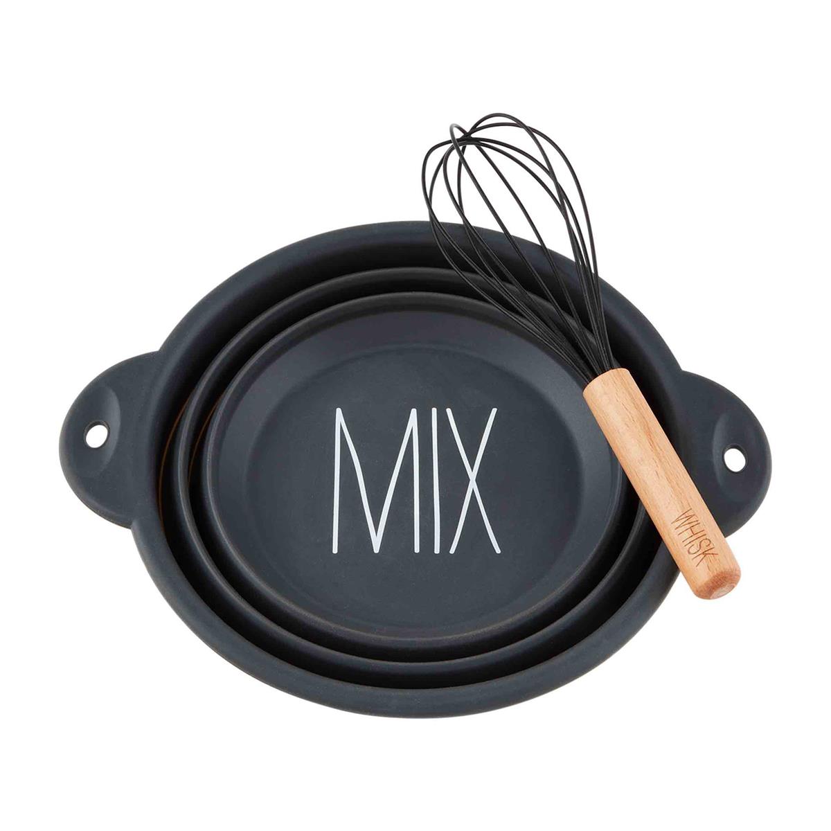 2-piece set. Collapsible silicone mixing bowl. Comes with wood and silicone whisk.