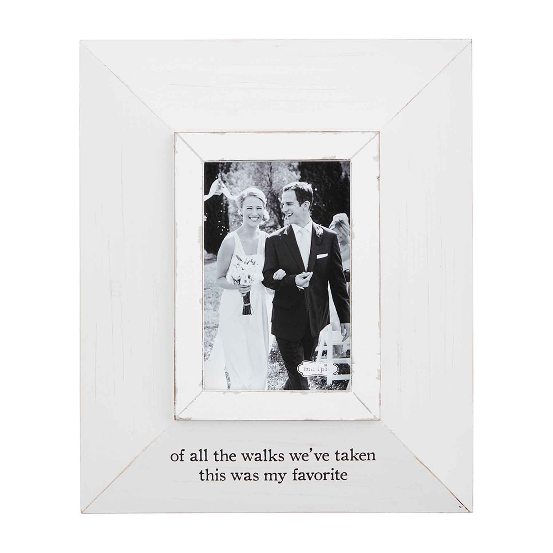 Distressed mitered wood frame stands with easel. Holds 4" x 6" photo.