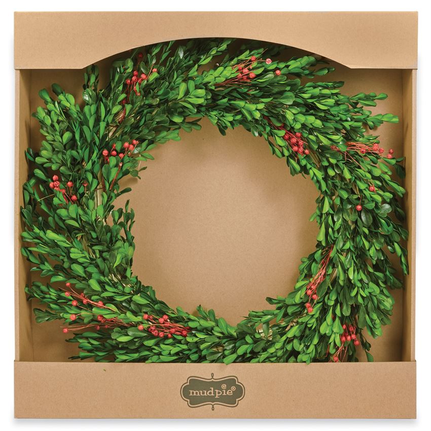Preserved genuine boxwood wreath features faux berry spray detail