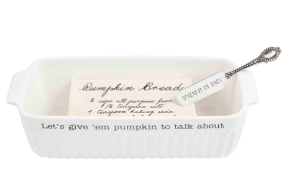 3-piece set. Fluted ceramic baking dish. Comes with stamped silverplate spreader and cotton recipe towel.