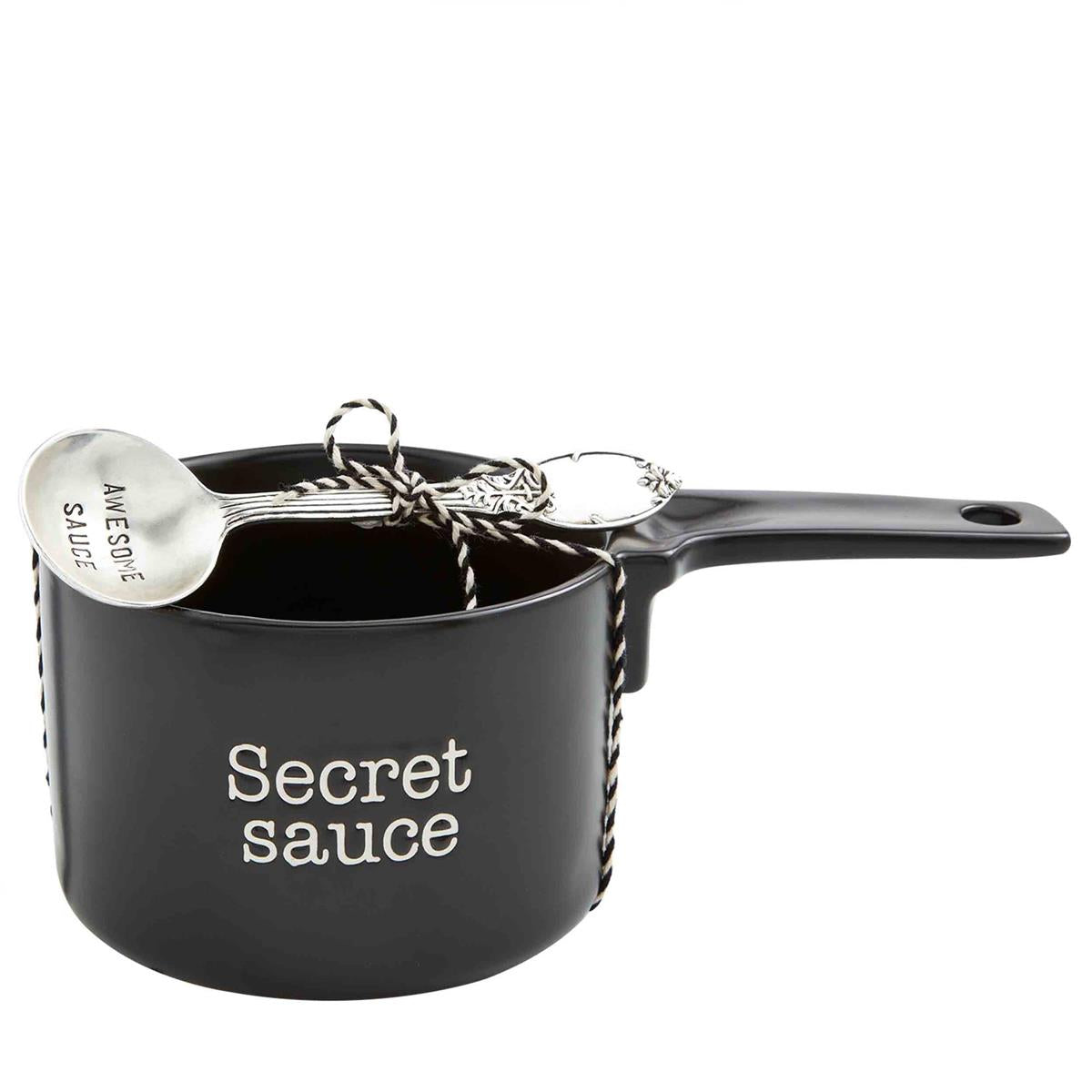 2-piece set. Glazed stoneware sauce dish with handle. Comes with silverplate spoon.