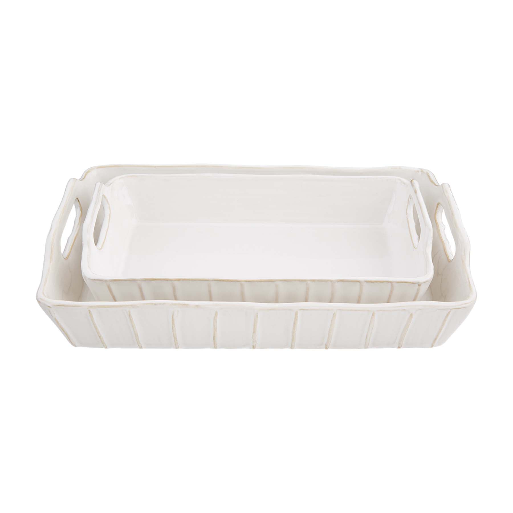 Nested set of two glazed stoneware baking dishes with dimensional side handles feature ribbed textured exteriors.