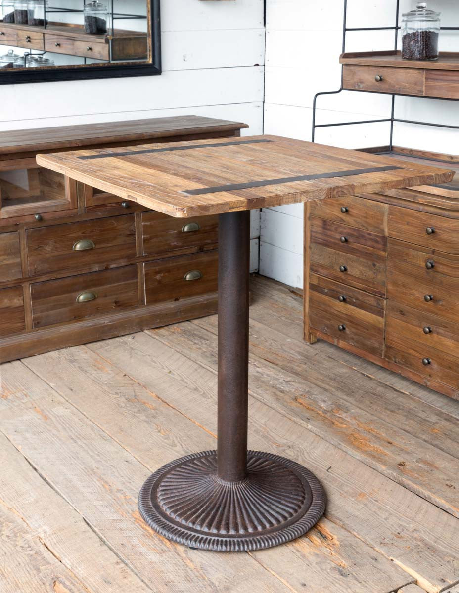 This vintage-style bar table is fashioned from reclaimed wood, metal strap supports, and a weighted disk base that features a subtle art deco design.